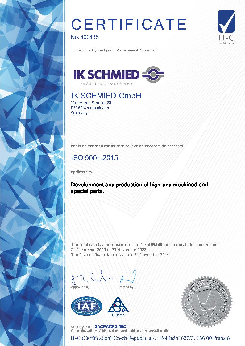The certificate is valid from 2020-11-24 until 2023-11-23 (First certification 2009). Certification ISO 9001:2015.